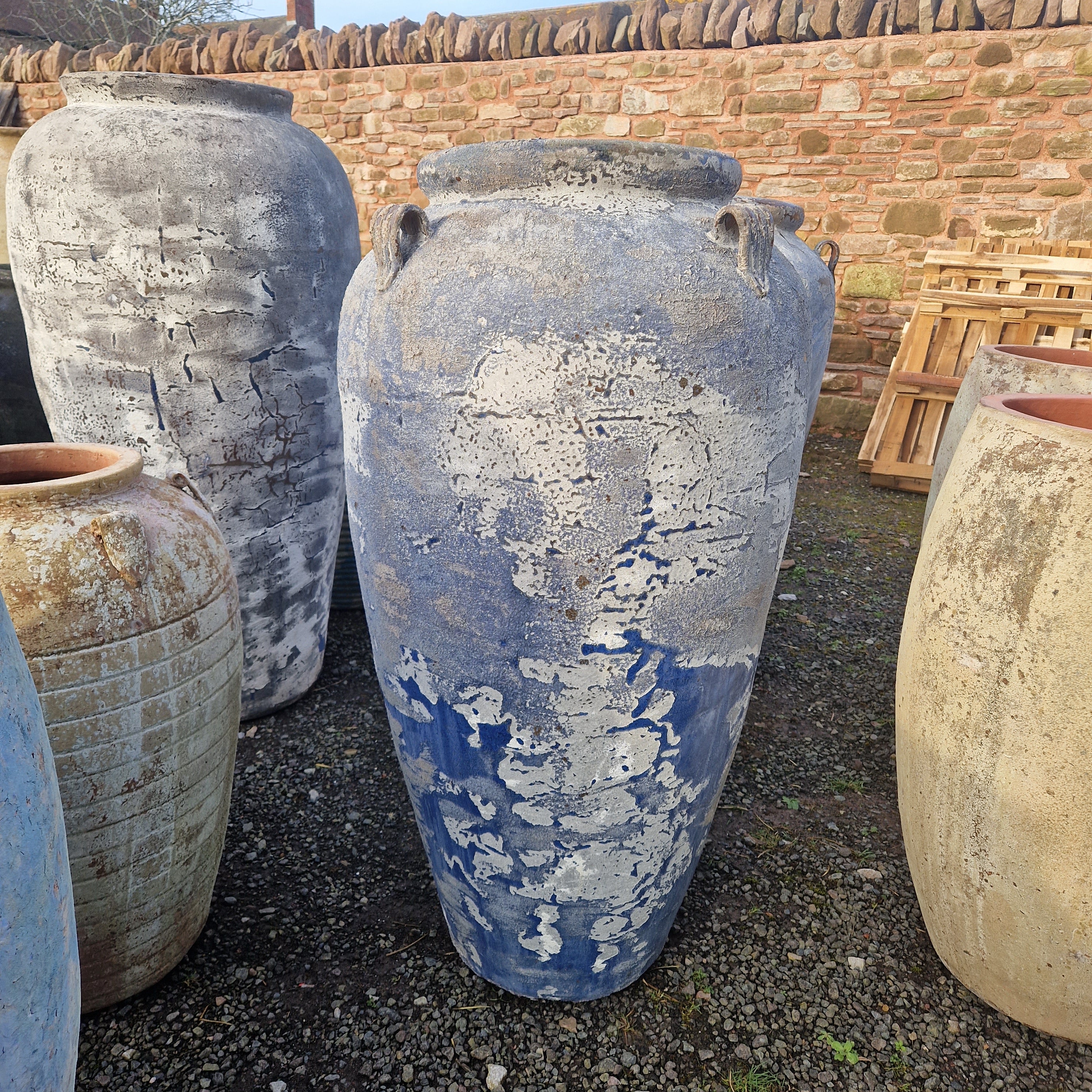 This extra large sculptural jar features a classic amphora-like design with four simple decorated handles around the shoulder. Finished in a hand-applied vibrant blue glaze.
