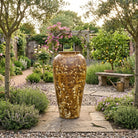 This extra large sculptural vase features a wide form and a bold, unusual brown / yellow glaze. Great for standing out amongst a green & luscious garden.