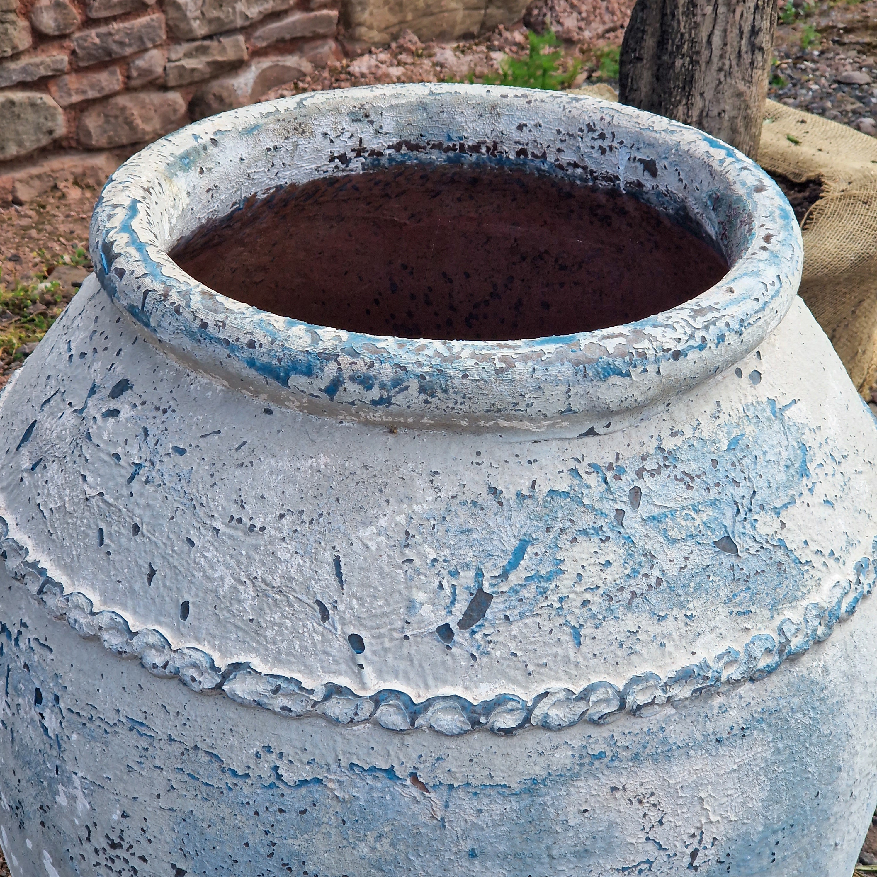 This large sculptural jar is a simple model featuring a lone rope-twist band on the upper-half of the body. Finished in a soft blue rustic glaze.