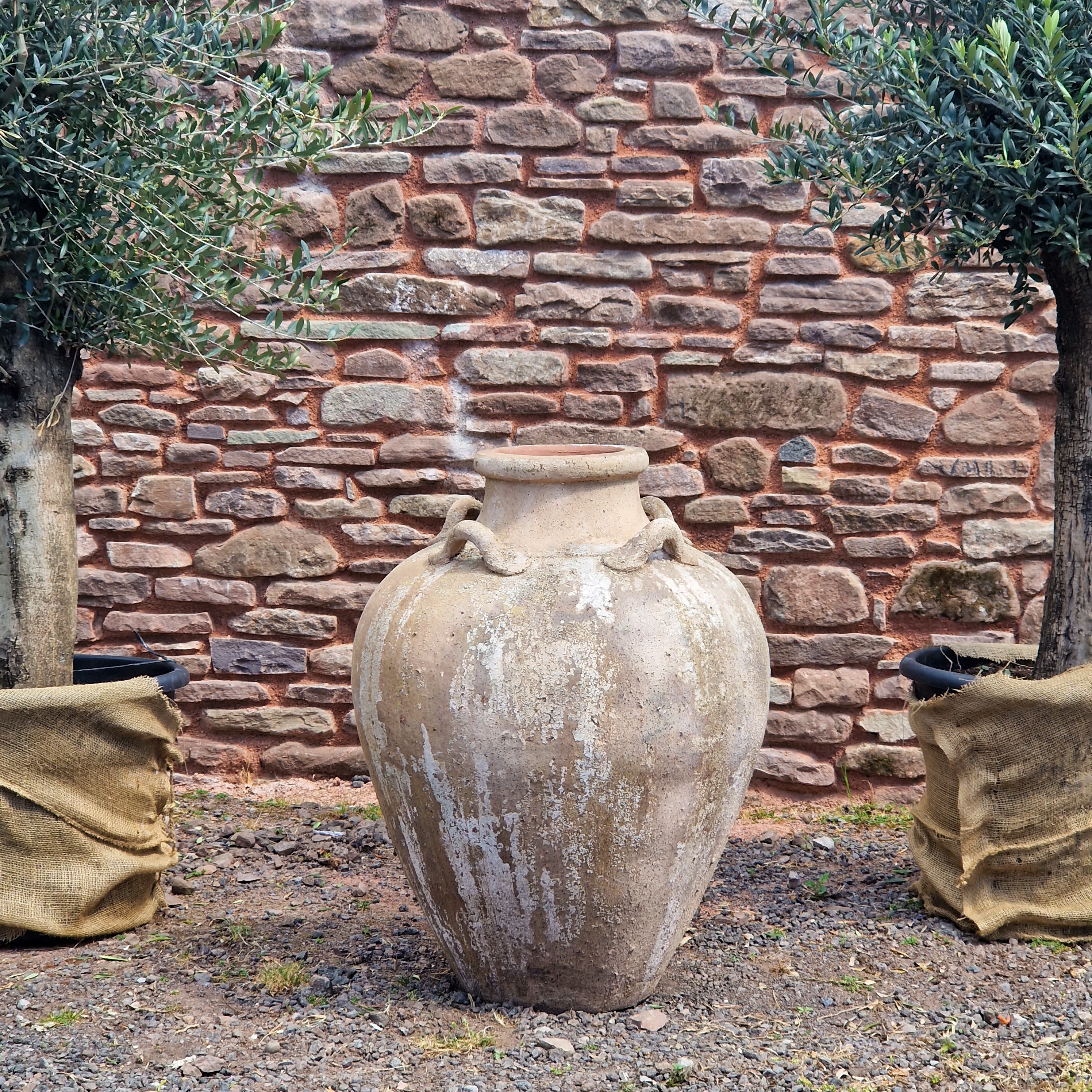 This large sculptural jar takes on a shapely design as the narrow foot steadily widens out to a broad dimension. The straight neck, rolled rim and horizontal, bold handles finish it off nicely.