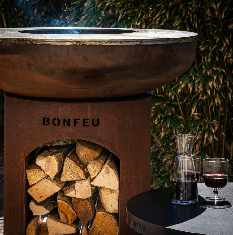 The BonBiza is a wide, innovative fire bowl-meet-grill from BonFeu. It is like a large barbecue but for plancha baking > so you can not only enjoy a cozy fire but also cook delicious meals on it.