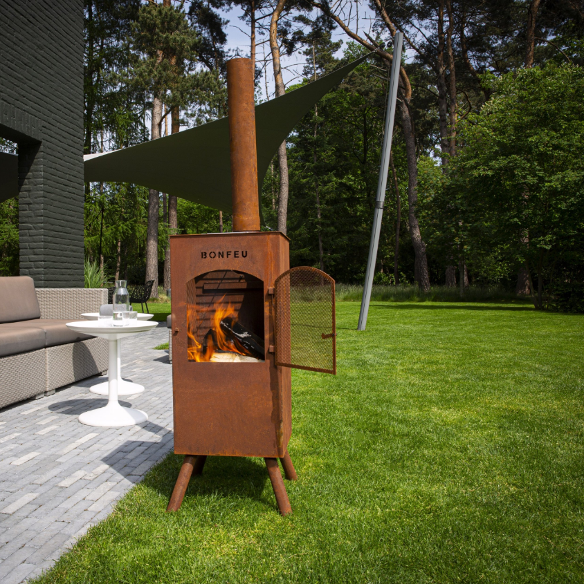 The unique aspect about the BonCarre is that it can also be used to cook food; The fireplace is topped with a removable lid . This can be taken off and replaced with a plancha or traditional bbq grill. You can also turn the lid over and use it as a cooking plate, for instance, to make a pot of tea. And while doing all of this, you can still enjoy the fire underneath.