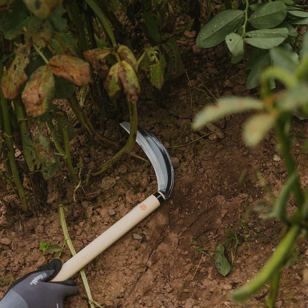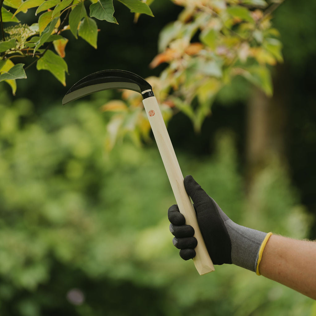 The single bevelled, Yasugi White Paper steel blade is light and precise enough for some serious grass scything, but robust enough for a bit of you-know-what with the tougher stuff, brambles etc. Nothing woody though.