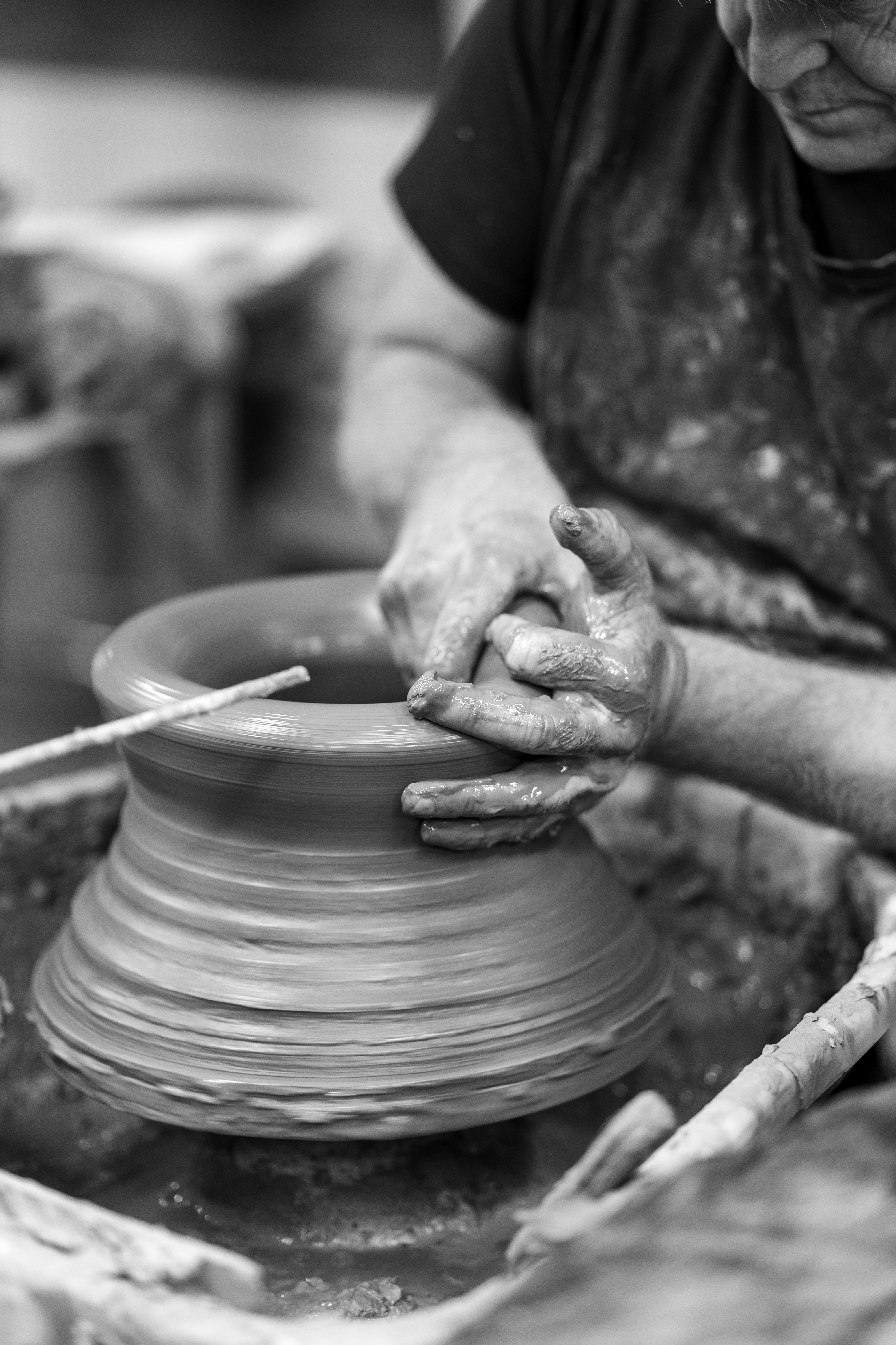 Small > large lumps of clay are placed on a wheel and carefully formed into shape by hand as they rotate. This is rarely a skill that anyone can naturally pick up on their first go - it often takes years to be able to consistently throw large, uniform pots.