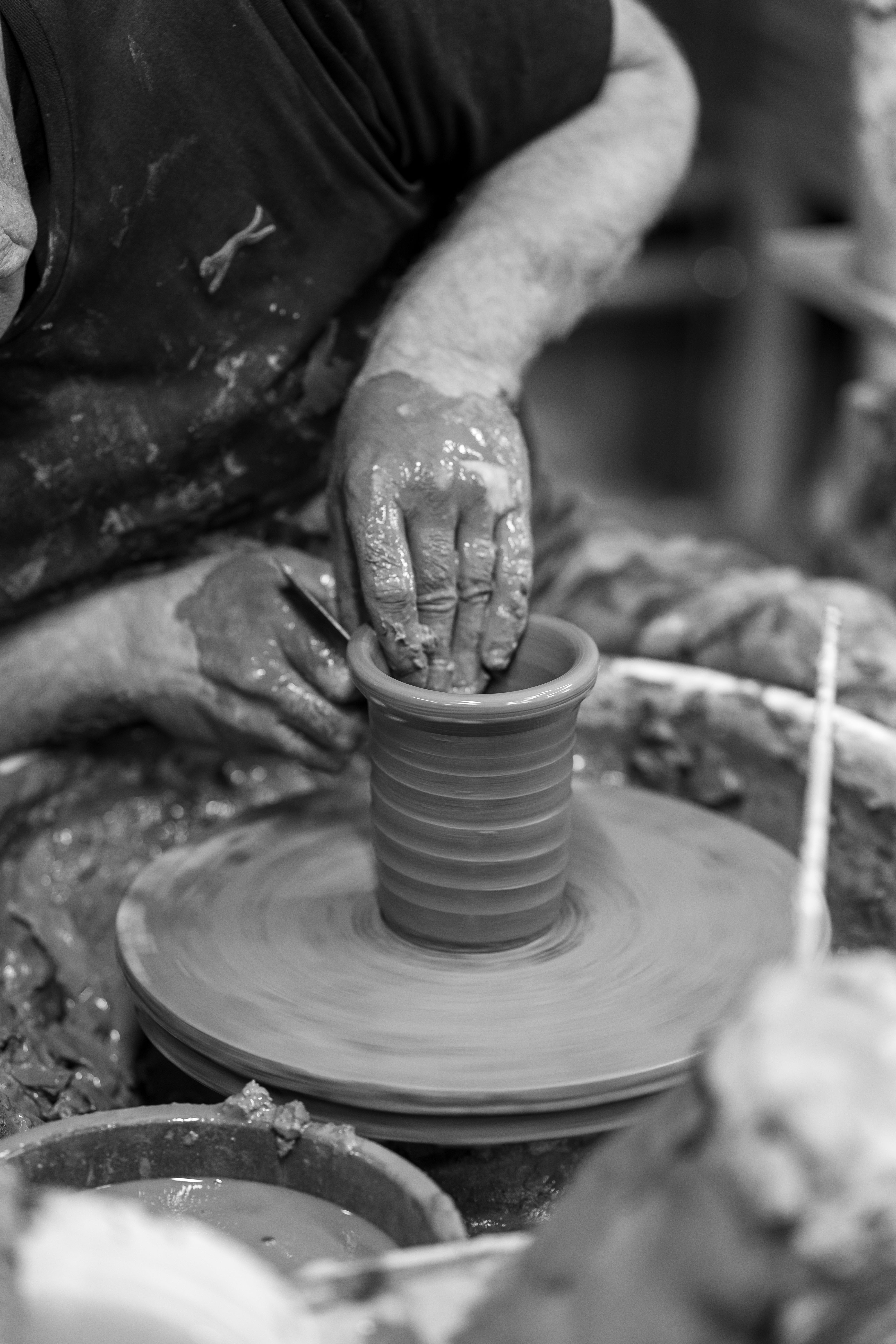 Small > large lumps of clay are placed on a wheel and carefully formed into shape by hand as they rotate. This is rarely a skill that anyone can naturally pick up on their first go - it often takes years to be able to consistently throw large, uniform pots.